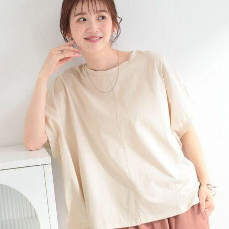 肩を落としたリラックス感のある形に、袖口のギャザーがさりげないアクセントを添えています。