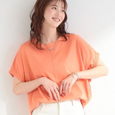 肩を落としたリラックス感のある形に、袖口のギャザーがさりげないアクセントを添えています。