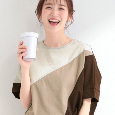 裾はラウンド気味の短め丈でボトムとのバランスが取りやすく、上部のみ布帛で立体感を出したのがポイントです。