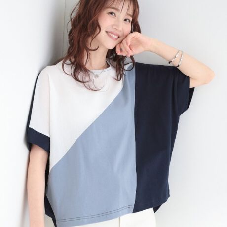 斜めの切り替えラインが視線を斜めに流し、着やせ見え効果を演出。