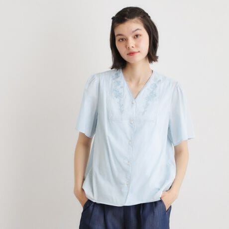 胸元の花刺繍と切り替えがポイントで、やわらかな印象に仕上がっています。