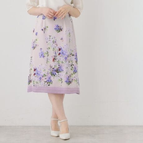 繊細なパネル柄を最大限に生かした柄行きがポイントの膝下丈のフレアスカート。