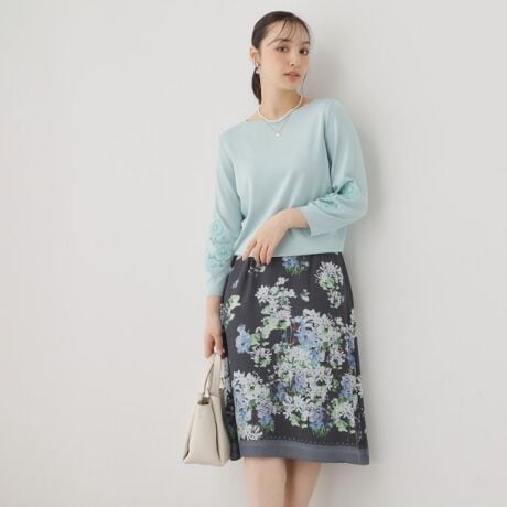 繊細なパネル柄を最大限に生かした柄行きがポイントの膝下丈のフレアスカート。