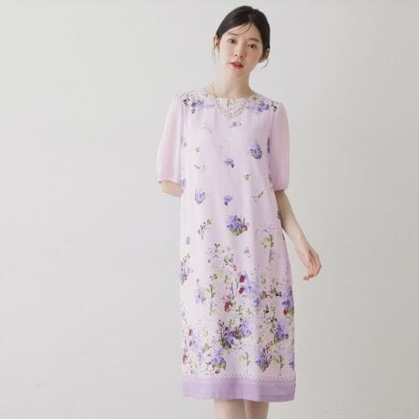 袖にシフォンを使用した色彩豊かな肘丈の花柄プリントワンピース。