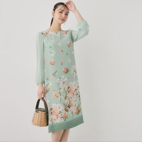 袖にシフォンを使用した色彩豊かな八分袖の花柄プリントワンピース。