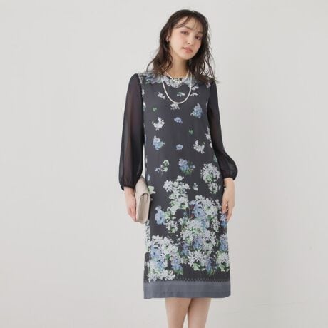 袖にシフォンを使用した色彩豊かな八分袖の花柄プリントワンピース。