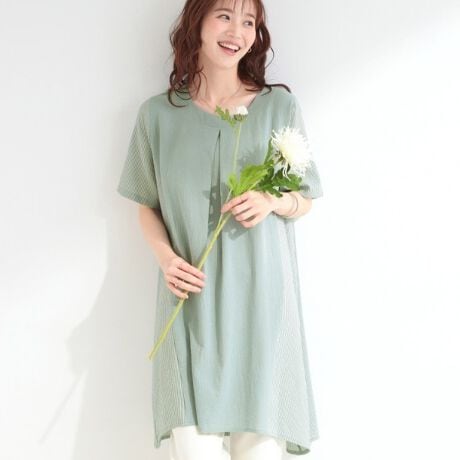 フロント部分はシボ感のある布帛素材で、袖と後身頃のストライプ部分は軽やかな布帛素材を使用しており、異素材の組み合わせが表情豊かな一枚に仕上がっています。