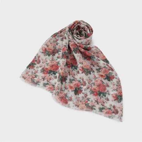 薄く広げて肩に添わせたり、適度に空気を含ませてふんわりと首回りに巻けば、ボリュームが出てエルストン ガーデンの華やかなプリントが際立つガーゼのストールです。