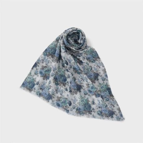 薄く広げて肩に添わせたり、適度に空気を含ませてふんわりと首回りに巻けば、ボリュームが出てエルストン ガーデンの華やかなプリントが際立つガーゼのストールです。