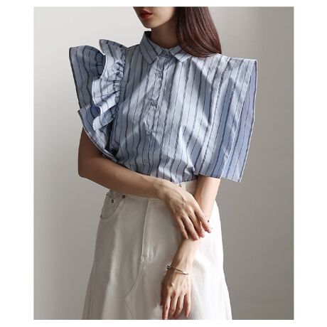 アシンメトリーなフリル袖が目を惹くブラウス。ブルーベースの爽やかなストライプで、軽やかさと華やかさを両立。シンプルなボトムス合わせでもしっかり映える一枚です☆