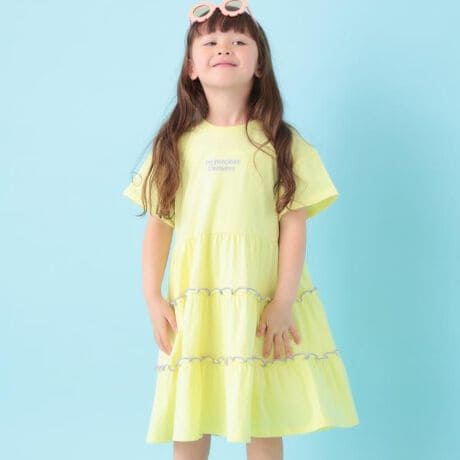 胸の刺繍と配色メロウがポイントになったティアードワンピース。