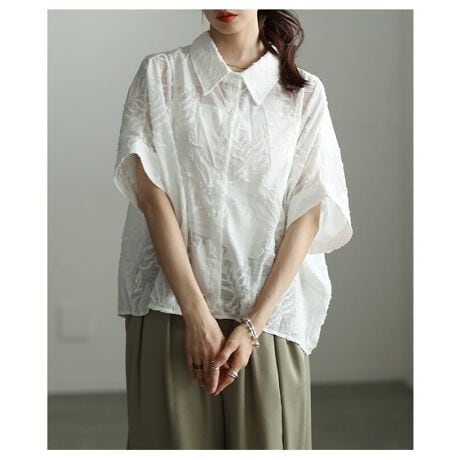 透かし柄が軽やかな印象を与えるドルマンシャツ。後ろ下がりのシルエットが自然な抜け感を生み、さらっと着るだけでこなれた雰囲気に。季節の変わり目にも活躍する一枚です☆
