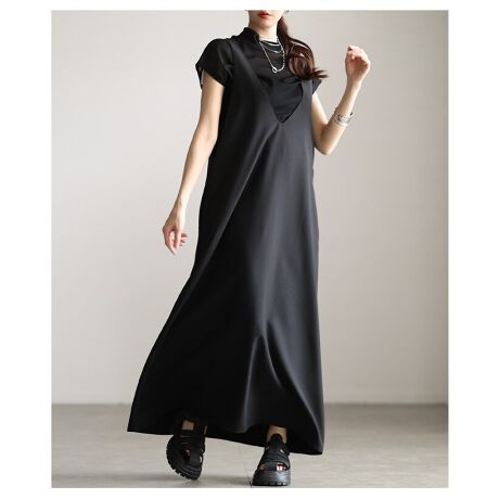 【ワンピース】 ジャンパースカート ロゴ 刺繍 Vネック ロング ノースリーブ Aライン ブラック