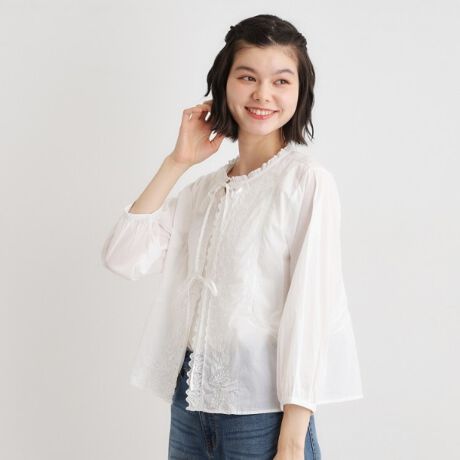 前立てに施された植物のようなモチーフの繊細なテープ刺繍が特徴的なインド製ブラウス。