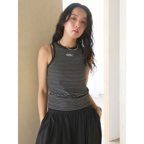 ストレッチ性のあるリブ素材とシアーメッシュが組み合わさり、女性らしさを引き立てるタンクトップ。