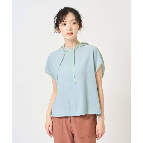 布帛とニットを組み合わせた、異素材ミックスのフード風プルオーバーです。前身頃にはシアーな布帛素材を使用し、前中心にあしらったステッチがさりげないアクセントになっています。ニット部分は片畦編みで立体感を持たせ、フード部分は軽やかな天竺編みで仕立てることで、全体に抜け感のある印象に仕上げました。