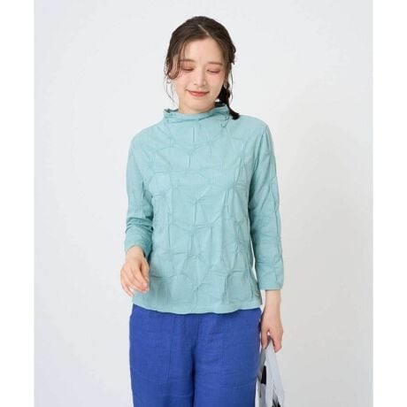 タック柄の凹凸でアルファベットを表現した、表情豊かなデザイン素材。見た目のおしゃれさだけでなく、さらっとした清涼感のある肌触りとストレッチ性を兼ね備え、快適な着心地を実現しています。ボトルネックデザインで首元をすっきり見せつつ、ボトムを選ばずコーディネートしやすいのも魅力です。1枚での着用はもちろん、ジャケットやカーディガンのインナーとしても活躍します。季節を問わず長く使える、着回し力の高い万能アイテムです。
