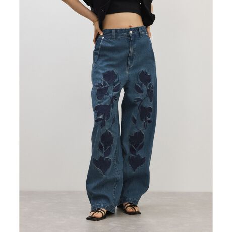 流れるような花のモチーフを大胆に刺繍したデニムパンツ。