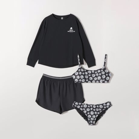 大人っぽく洋服見えするラッシュガード&パンツと、フラワーモチーフのビキニの4点セット。