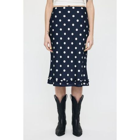 【SATIN DOT SKIRT/ サテンドットスカート】■ポイント程よいコントラストで普段ドット柄を着ない方にもチャレンジしやすい配色のドットスカート。バイアスカットによる自然な落ち感と裾のフリルがポイントです。■ディテール裾のフリルが主張しすぎず、デザインのアクセントになっていて、フェミニンな印象をプラスしてくれます。カラーはどんなアイテムにも相性の良いアイボリーと落ち着いたミッドナイトネイビーのドットを展開。■スタイリングニットやカットソーを合わせたデイリー使いはもちろん、シャツやジャケットと合わせればきれいめな着こなしにも対応。シーズンを問わず着回しの効く一枚です。■商品のお気に入り登録お気に入りアイテムの再入荷・在庫1点などの通知を受け取ることができます。■ブランドのお気に入り登録新作アイテムの入荷や人気アイテムの再入荷、おすすめトピックスなど、いち早くブランドの情報を受け取ることができます。[注意事項]※画像の商品はサンプルです。実際の商品と仕様、加工が若干異なる場合があります。※画像の商品は光の照射や角度、お使いのモニター環境により、実物と色味が異なる場合がございます。※着用、お取り扱いの際は、アテンションタグをご確認ください。