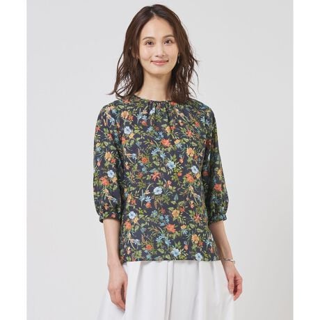 華やかなボタニカル柄で彩る、フロントギャザーが女性らしいクルーネックブラウス