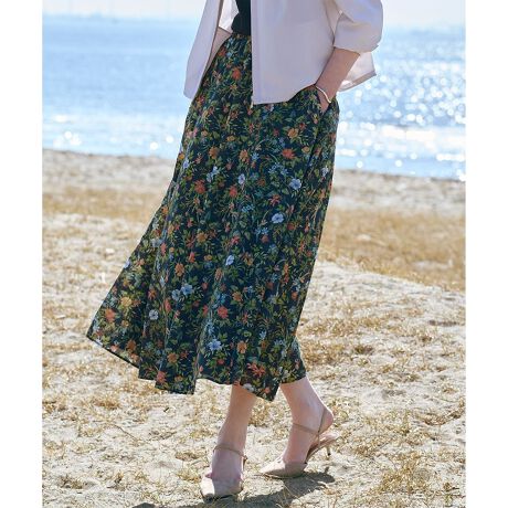 鮮やかなボタニカル柄が映える、ナチュラルで華やかなフレアスカート