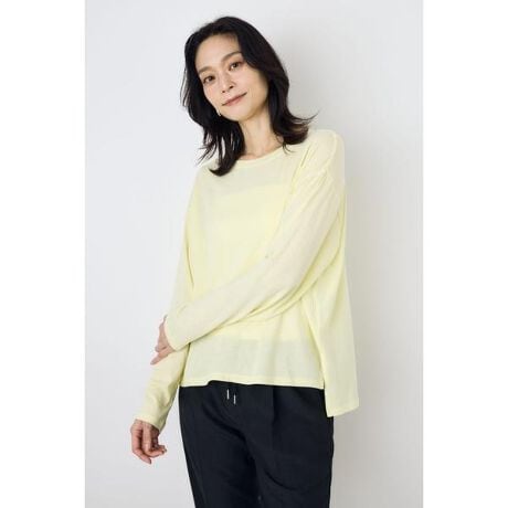 ■シアーカットトップス■ポイント軽やかな透け感が魅力の、ゆったりシルエットのシアーTシャツ。抜け感のあるデザインで、シンプルながらトレンド感のあるスタイリングが楽しめる1枚です。■ディテールゆったりとしたシルエットで身体のラインを拾いにくく、リラックス感のある着用感。程よい透け感がレイヤードスタイルを引き立て、インナーとの組み合わせでさまざまな表情を楽しめます。シンプルなデザインで、デイリーに取り入れやすいアイテムです。■スタイリングキャミソールやタンクトップをインナーに合わせたレイヤードスタイルがおすすめ。デニムやカーゴパンツと合わせたカジュアルスタイルはもちろん、スラックスやスカートと合わせて女性らしく着こなすのも◎。軽やかな素材感で、シーズンムードを高めてくれるトップスです。■生地全方向に非常に伸びが良く、かつ型崩れしにくい素材です。40番手というやや細めの糸で編まれているため、薄手で軽く上品でクリーンな透け感がありつつも独特のフィット感があるのでストレスフリーな着心地です。甘編みなので、生地のひっかけに注意してください。また、生地の一部にネップが発生していることがありますが、生地の特性です。透け感:あり裏 地:なし伸縮性:あり光沢感:なし[注意事項]※画像の商品はサンプルです。実際の商品と仕様、加工が若干異なる場合があります。※画像の商品は光の照射や角度、お使いのモニター環境により、実物と色味が異なる場合がございます。※着用、お取り扱いの際は、アテンションタグをご確認ください。