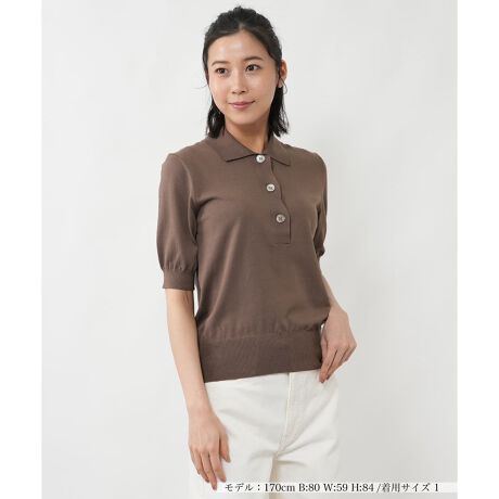 コットン仕立ての柔らかな肌当たりが心地よい、ベーシックなデザインのニットポロシャツです。前立てに配された大きめのシェル調ボタンが上品な光沢を放ち、スポーティーなアイテムの中に洗練された女性らしさを演出。程よく身体に沿うスマートなシルエットと袖口や裾の長めのリブ切り替えがメリハリのある美しい佇まいを後押しし、五分丈の程よくふんわりとした袖が気になる二の腕をさりげなくカバーしつつ柔らかな印象を与えます。