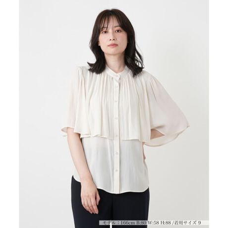 「BOURGE」が提案する、フロントから袖にかけて贅沢に重ねたデザインが目を惹くレイヤード風のバンドカラーブラウスです。動くたびに軽やかに揺れるシアーな素材感が、計算された奥行きとドラマチックな華やぎを演出。首元をすっきりと見せるバンドカラーが知的な品格を添え、大人の女性にふさわしいエレガントな佇まいを叶えてくれます。気になる二の腕を品よくカバーするフレアスリーブと、肌離れの良いさらりとしたリラクシーな素材感もポイント。
