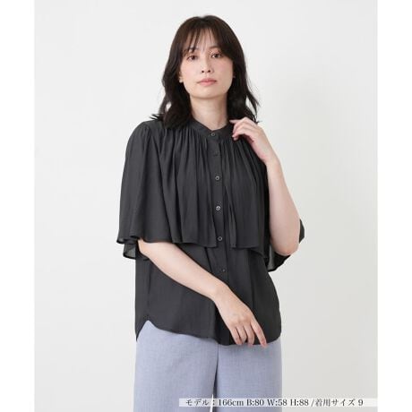 「BOURGE」が提案する、フロントから袖にかけて贅沢に重ねたデザインが目を惹くレイヤード風のバンドカラーブラウスです。動くたびに軽やかに揺れるシアーな素材感が、計算された奥行きとドラマチックな華やぎを演出。首元をすっきりと見せるバンドカラーが知的な品格を添え、大人の女性にふさわしいエレガントな佇まいを叶えてくれます。気になる二の腕を品よくカバーするフレアスリーブと、肌離れの良いさらりとしたリラクシーな素材感もポイント。