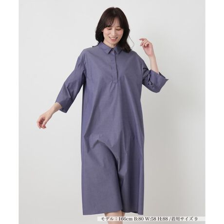 比翼仕立てのフロントがクリーンな印象を与える、七分袖のシャツワンピースです。コットンにポリエステルをブレンドしたさらりとした生地を使用しており、軽やかな着心地と上品なハリ感を両立しました。後ろヨークに施された細かなギャザーがバックスタイルに柔らかなボリュームと女性らしいニュアンスをプラス。程よくゆとりのあるサックシルエットが身体のラインを優しくカバーし、一枚でリラクシーかつ洗練された佇まいを演出します。落ち着いたトーンが知的なムードを醸し出し、デイリーからお出かけまで品よく着こなせる贅沢な一着です。