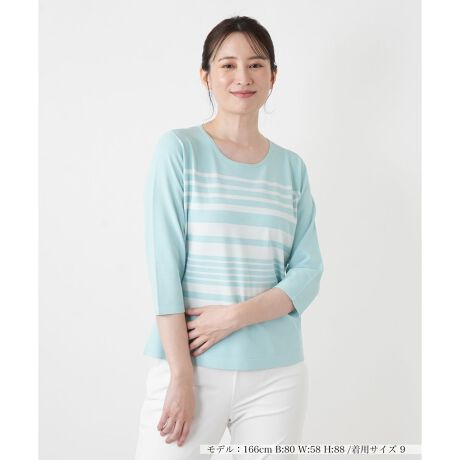 ピッチ幅に変化をつけたリズミカルなボーダー柄が目を惹く、クルーネック仕様のニットプルオーバーです。レーヨンにポリエステルをブレンドした素材を使用しており、滑らかな肌触りと適度なストレッチ性で快適な着け心地を叶えます。手首周りをすっきりと見せる七分袖は、一枚着としてはもちろんジャケットのインナーとしても重宝間違いなし。明るく柔らかな配色が顔周りを華やかに演出しながら、春らしい軽やかさを運んでくれます。
