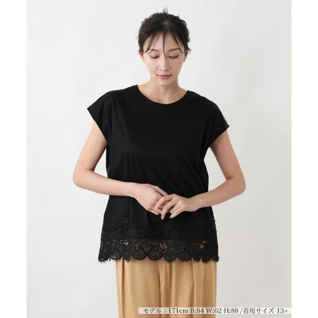 裾にあしらわれた幅広のレースが、装いに華やかなアクセントを加えます。繊細な透かし模様と、波のようにかたどられた裾のラインが、見た目にも軽やかな印象を与えます。肩のラインをきれいに見せるフレンチスリーブとシンプルな身頃のデザインが、裾のレースの美しさを一層引き立てます。一枚で着るだけで、品のある着こなしが完成するトップスです。