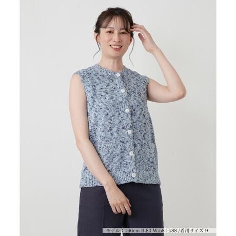 味わい深い表情を醸し出す、美しいメランジ調のニットベストです。素材にペーパーをブレンドすることで、さらりとしたドライな肌触りと、型崩れしにくい適度なハリ感を実現しました。コンパクトなネックラインとフロントに並ぶボタンがきちんと感のあるクリーンな印象を与えます。ブラウスやカットソーとのレイヤードはもちろん、ノースリーブニットとしても映える一枚。季節の変わり目から盛夏まで、日常のコーディネートに軽やかな奥行きを与えてくれるアイテムです。