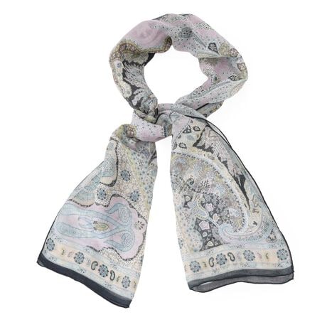オリエンタル調のペイズリー柄を落ち着いたトーンで描いた、「BINDA」の大判ストールです。レーヨンと麻、シルクをブレンドした上質な生地を使用しており、麻の清涼感とシルクの優雅な光沢、滑らかな肌触りを同時に楽しめます。薄手で軽やかな質感は、首元に巻いた際も重たくなりすぎず、美しいドレープを描くのが魅力。春夏の冷房対策や日差し除けとしてはもちろん、季節の変わり目のアクセントとしても重宝しそうなエレガントなアイテムです。