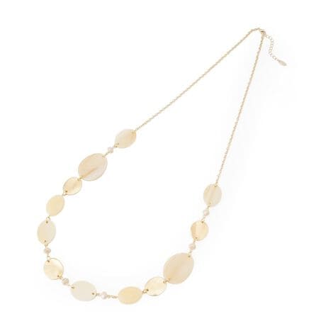 ニュアンスの異なるオーバルパーツを連ねた、エレガントなロングネックレスです。マーブル調のアクリル樹脂や光沢のあるメタルパーツ、繊細なカットガラスを組み合わせることで、リズム感のある華やかな胸元を演出。縦長のラインを強調するシルエットは、スタイルアップ効果が期待できるのもポイント。シンプルなブラウスやワンピースに合わせるだけで、大人の洗練されたスタイリングが完成します。普段使いからお出かけまで幅広いシーンで重宝する存在感のあるアクセサリーです。