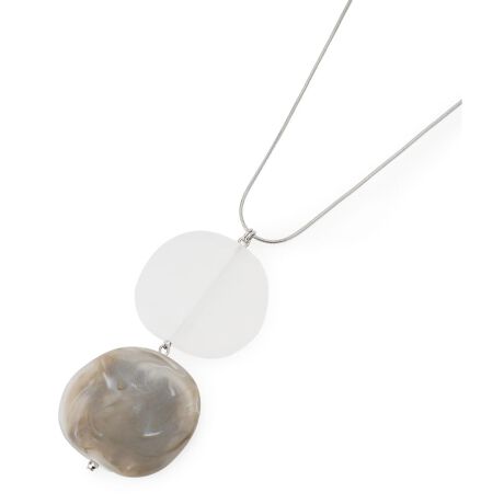 マーブル模様とフロスト加工、質感の異なる大ぶりのパーツを縦に繋いだ、モダンなデザインのペンダント。長さの調節が可能なシンプルなチェーンを合わせることで、パーツの存在感を引き立てています。クールな色調が、夏の装いにスタイリッシュで都会的な印象をプラス。シンプルなTシャツやブラウスに合わせるだけで、ぐっとこなれた雰囲気に仕上がります。縦のラインを強調するデザインは、スタイルアップ効果も期待できるのが嬉しいポイント。コーディネートの主役になる、存在感のあるアクセサリーです。