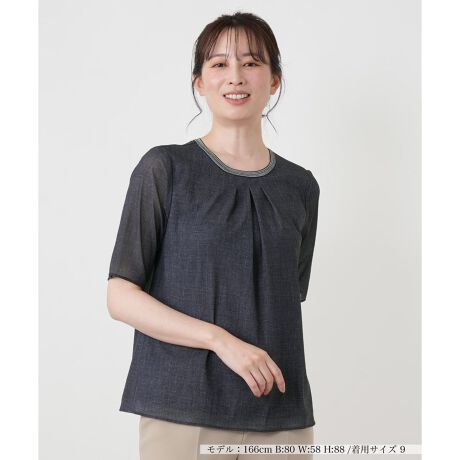 落ち着いた色合いの身頃に、襟元のラメ混リブが華やかなアクセントを添えるタックカットソーです。フロントに施された深めのタックが立体的なシルエットを生み出し、お顔周りをすっきりと上品な印象に見せてくれます。表地は清涼感のある質感ながら、裏地には伸縮性に優れた素材を採用しているため、長時間の着用でもストレスフリーな着心地を感じられるのがポイント。二の腕をカバーする絶妙な袖丈と、程よく広がる裾のラインが女性らしい柔らかな佇まいを演出します。