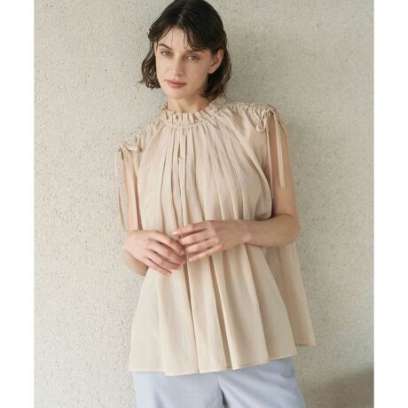 「BOURGE」が提案する、トリアセテートにコットンをブレンドした上質な素材感のノースリーブギャザーブラウスです。首元にゴムを通すことで生まれるフリルとギャザーのドレープが、フェミニンかつ華やかなニュアンスを演出。さらに肩口にあしらわれたリボンのほんのり甘いアクセントが、大人の遊び心を感じさせる佇まいを後押ししてくれます。すとんと落ちるようなシルエットでリラックスムードを醸し出し、一枚で旬のコーディネートを叶えてくれるトップスです。