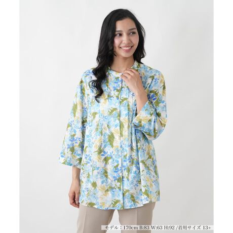 繊細な花柄が上品な印象を醸し出す、スタンドカラーの七分袖ブラウス。首元をすっきりと見せるスタンドカラーが、甘すぎない大人のエレガンスを演出します。風に揺れるような軽やかな素材感が、見た目にも涼しげな雰囲気をプラス。気になる二の腕を自然にカバーしてくれる七分袖は、手元に抜け感を与え、腕時計やブレスレットを美しく引き立てます。ご自宅でのお手入れがしやすい点も、日常使いに嬉しいポイント。シンプルなスカートやパンツに合わせるだけで、気品あふれるコーディネートが完成する、主役級の一枚です。