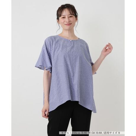 清涼感溢れるストライプがこれからの季節に映える、コットン仕立てのフレアブラウスです。肩のラインを落としたドロップショルダーから続くふんわりとした袖が、気になる二の腕をカバーしつつ女性らしい柔らかなシルエットを演出。首元をすっきりと見せるノーカラーの襟元と、前後差をつけたラウンドヘムがさらりと纏うだけで大人の抜け感をプラス。肌離れの良い上質なコットン素材を使用しており、リラックスした着心地ながらも都会的でクリーンな佇まいを叶えてくれる着回し力高い一枚です。
