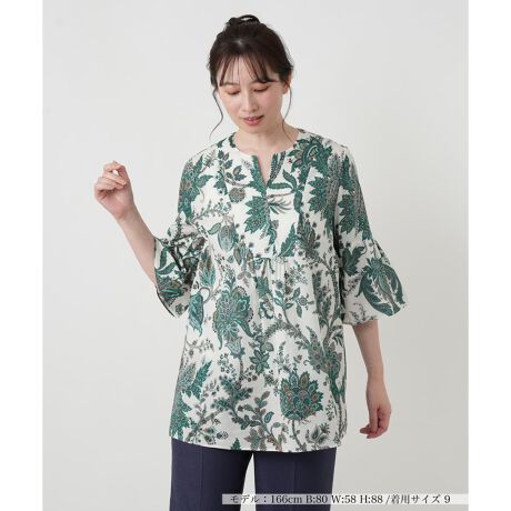 エキゾチックなペイズリー柄を全面に描いた、華やかなキーネックブラウスです。お顔周りをすっきりと見せるシャープな襟元のラインと、袖口に向かってふんわり広がるフレアスリーブが女性らしく優美なシルエットを演出します。肌当たりの良いコットンを使用しており、ヒップまでナチュラルに隠れる丈感でスタイルアップ効果が期待できるのも嬉しいポイント。背中にはファスナーを配しており、着脱がスムーズに行える実用性も兼ね備えています。