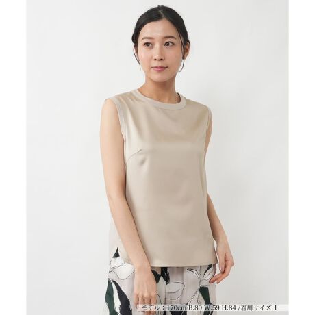 フロントに上品な光沢を放つポリエステルサテン、バックにさらりとしたコットン混の編地を配した、異素材切り替えのノースリーブカットソーです。質感のコントラストが奥行きを与え、カジュアルなアイテムながらも都会的で洗練されたムードを醸し出します。首元をすっきりと見せるコンパクトなクルーネックと、程よく身体に沿うシルエットが大人の女性にふさわしいスマートな佇まいを演出。一枚での着用はもちろん、ジャケットのインナーとしても映える艶やかな表情のアイテムです。