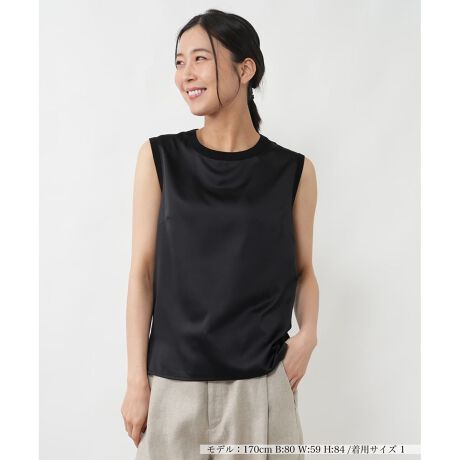 フロントに上品な光沢を放つポリエステルサテン、バックにさらりとしたコットン混の編地を配した、異素材切り替えのノースリーブカットソーです。質感のコントラストが奥行きを与え、カジュアルなアイテムながらも都会的で洗練されたムードを醸し出します。首元をすっきりと見せるコンパクトなクルーネックと、程よく身体に沿うシルエットが大人の女性にふさわしいスマートな佇まいを演出。一枚での着用はもちろん、ジャケットのインナーとしても映える艶やかな表情のアイテムです。