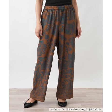 流れるような美しいプリントが目を惹く、イタリア・ARGENTI社の上質な素材を使用したパンツ。大胆な柄いきが縦のラインを自然に強調し、脚をすっきりと長く見せてくれる効果が期待できます。洗練された雰囲気の中にもリラックス感があり、シンプルなトップスを合わせるだけで装いが華やかに決まります。伸縮性に優れた素材とウエストゴム仕様で、快適なはき心地を追求しました。ご旅行やお食事会など、長時間座っていることの多いシーンでも、ストレスなくお過ごしいただけます。ご自宅でお手入れしやすい特性も備えており、日常のエレガンスを気軽に楽しめる一着です。
