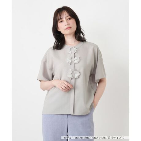 フロントに贅沢にあしらわれた立体的なフラワーモチーフが、華やかな存在感を放つ「BOURGE」らしい比翼仕立てのブラウスです。落ち着いたトーンの身頃に、同系色のモチーフを配することで、甘くなりすぎず大人の女性にふさわしい洗練されたクラス感を演出。すっきりとしたノーカラーの首元と比翼ボタンによるクリーンなラインが知的な佇まいを叶えてくれます。サイドに施された前後差のあるスリットとゆったりとしたシルエットが現代的なリラックスムードをプラス。これからの日常のコーディネートをドラマチックに格上げしてくれる贅沢な一枚です。