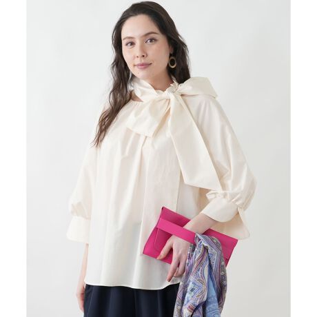 顔周りを華やかに彩る、タイ付きの七分袖ブラウスです。上品な光沢感のある生地に、取り外し可能なタイが付属しており、その日の気分やシーンに合わせて異なる表情を楽しめます。タイをリボン結びにすればフェミニンに、一掛けすればマニッシュで洗練された印象に。ノーカラーの丸首デザインが、首元をすっきりと見せてくれます。手首の見える七分袖は、軽やかで涼しげな雰囲気を演出し、ブレスレットなどのアクセサリーも美しく映えます。ご自宅でお手入れしやすいイージーケア性も魅力の一つ。一枚で着映えするデザインは、お食事会や観劇など、少し華やかに装いたい日にぴったりのアイテムです。