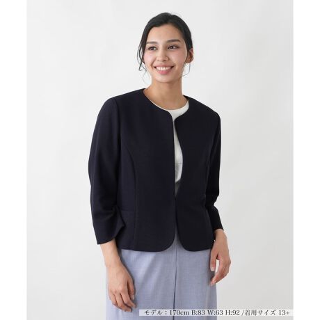 タウンエレガンスな装いに欠かせない、洗練されたノーカラージャケット。すっきりとしたノーカラーの丸首デザインが、顔周りに優しく上品な印象を与えます。手首がのぞく七分袖は、軽やかな抜け感を演出し、ブレスレットなどの手元のアクセサリーを美しく引き立てます。無駄のないシンプルな無地のデザインだからこそ、上質な素材感と計算された美しいシルエットが際立ちます。ワンピースにさらりと羽織ればフォーマルな席にも対応でき、パンツスタイルに合わせればスマートな通勤スタイルが完成。着回し力が高く、様々なシーンで活躍する、ワードローブの頼れる一枚です。