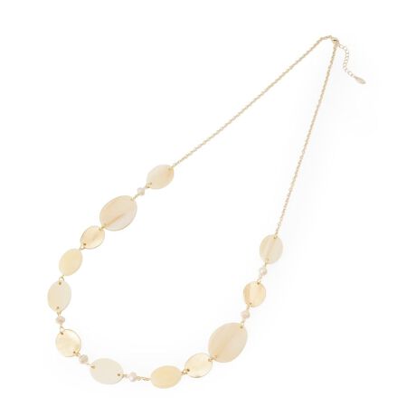 大きさや質感の異なるプレートをリズミカルに連ね、胸元に豊かな表情を添えるデザインです。艶のあるパーツと柔らかな光を透かすパーツの組み合わせが、奥行きのある輝きを演出します。プレートの間に配された小さなパーツが、繊細なアクセントとしてきらめきます。シンプルな装いにプラスするだけで、顔周りを華やかに見せてくれるアイテムです。