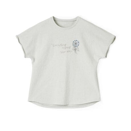 ドリームキャッチャーのモチーフにビーズやホットフィットをあしらい、繊細な輝きと立体感を表現したクルーネックカットソー。「Everything is going Your Way.(すべてはあなたの思い通りに)」というポジティブなメッセージが添えられ、身にまとうだけで心が弾むようなデザインに仕上げました。袖口の断ち切りロールやゆったりとしたフレンチスリーブが、大人のリラックス感を演出。デイリースタイルにひと味違った個性と遊び心をプラスしてくれるアイテムです。